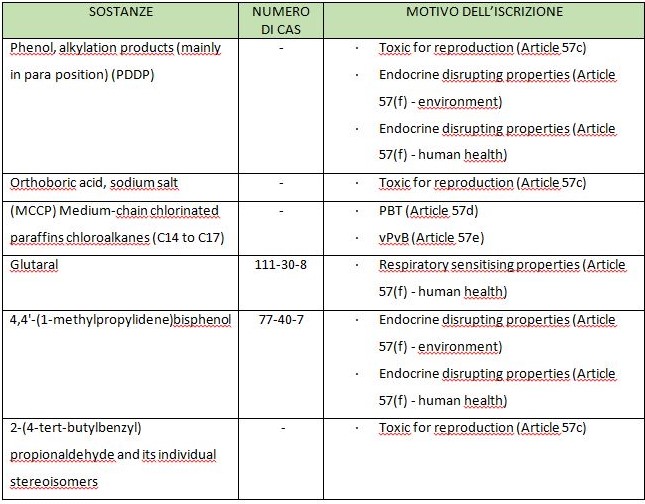Di seguito le nuove sostanze aggiunte in candidate list: