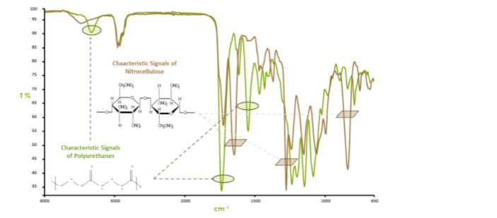 In ambito conciario, la tecnica risulta essere particolarmente efficace per la caratterizzazione e lo studio delle criticità dei polimeri di rifinizione, come emerso da numerosi lavori svolti dalla Stazione Sperimentale, che hanno evidenziato il ruolo cruciale di tale metodo spettroscopico per l’identificazione di una vasta gamma di difetti di rifinizione (Fig.2) (Naviglio B., Calvanese G., Florio C. – The characterization of chemicals used in finishing – XXIX IULTCS Congress, Washington (USA), 21-24, June, 2007 – CPMC, 2007, 83 (4): 225-245; Florio C., Calvanese G., Naviglio B., Mascolo R., Grasso G. – Finishing defects. A special case concerning pigmented finishing based on TiO2 – CPMC, 2009, 85(3), 131-143; Florio C., Mascolo R., Calvanese G. – Patent and laminated leather: the role of crucial parameters in the damage of fashion goods – XXX IULTCS CONGRESS, 365, BEIJING (CINA), October 11-14 2009; ARS TANNERY, 2(3/4), 57-61/62-67(2011); Florio C.; Mascolo R.; Calvanese G.; Naviglio B. – What causes laminated leather defects – Leather International, 2010, 212 (4799): 24-28; Florio C., Mascolo R., Calvanese G., Naviglio B. – Difetti del cuoio laminato. Caratteristiche dei materiali di copertura – X° AICC Conference, Serino, April 30 2010 – International Congress “dalla Pelle alla Moda”, Turbigo (MI), October 16 2010. CPMC, 2011, 87 (1): 3-15; Florio C., Calvanese G., Naviglio B. – Finishing issues and light-dependent properties of pigments – XXXIII IULTCS CONGRESS, Novo Hamburgo, (BRASILE), 24-27 Nov. 2015, PDF 191; CPMC, 2016, 92(2/3), 87-94; – Florio C., Aveta R., Calvanese G., Naviglio B. – Advanced diagnostics and innovative solutions for leather defects: the problem of yellowing. JSLTC – Journal- Society of Leather Technologists and Chemists – December 2019. 103(6):296-304.