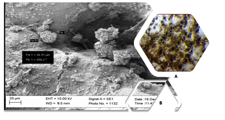 Fig. 1: macchie osservate al microscopio ottico (A) e danneggiamenti del fiore osservati al SEM (B), determinati dalla presenza di C. cladosporioides