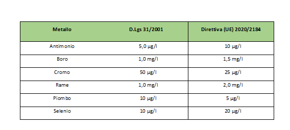 Metalli: di seguito schematizzato in tabella le modifiche apportate ai nuovi limiti di riferimento: