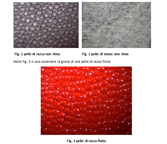 Nelle figure 1 e 2 i riportano immagini ottenute con uno stereomicroscopio delle superfici di pelli di razza e di tonno solo conciate.