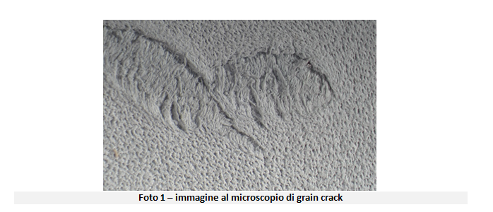 In particolare, durante il rinverdimento, le pelli troppo secche, soprattutto quando lo strato centrale non è idratato, possono subire screpolature per effetto della irregolare tensione esercitata dal gonfiamento. Tale fenomeno è conosciuto in letteratura con il nome di “grain crack” (foto 1).