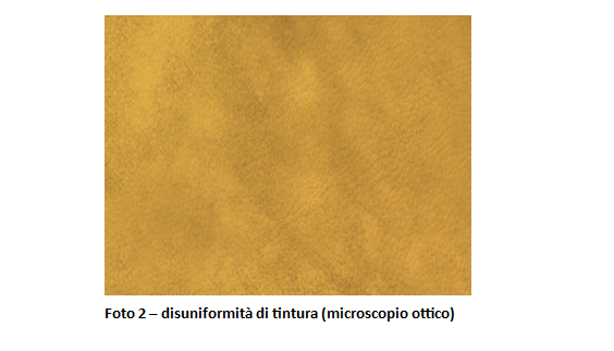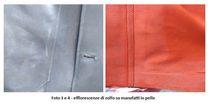 Una delle problematiche che si possono verificare è la comparsa di efflorescenze di zolfo (foto 3 e 4) che può derivare dall’ossidazione del solfuro e solfidrato di sodio utilizzato per la depilazione.