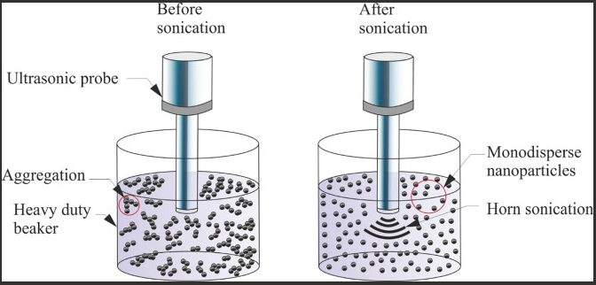 I parametri che influenzano la sonicazione sono: la potenza impostata, la frequenza di applicazione, ed il numero di cicli di sonicazione (tempo); in particolare, fissate le prime due variabili, la riduzione delle dimensioni delle particelle aumenta all’aumentare dei tempi di applicazione. Su scala laboratorio, esistono due tipi di sonicatori principali: il bagno ad ultrasuoni, nel quale la soluzione viene immersa in un apposito contenitore e la sonda sonicatrice che, invece, viene immersa direttamente nella soluzione. La differenza tra i due dispositivi è in termini di potenza massima: mentre la sonda sonicatrice consente una potenza compresa tra 100 W e 1.500 W, il bagno lavora a potenze inferiori, ovvero di circa 100 W. Se consideriamo la potenza, come precedentemente accennato, è necessario tenere in considerazione due importanti aspetti: l’utilizzo di elevate potenze e le applicazioni prolungate che, in entrambi i casi, possono determinare il danneggiamento delle particelle e la possibile degradazione mezzo disperdente per effetto del riscaldamento localizzato. Questi effetti possono essere limitati lavorando non con un’applicazione in continuo, ma in modalità pulsante nella quale gli intervalli di sonicazione in potenza sono intervallati da pause predeterminate. Questo tipo di procedura risulta generalmente utilizzabile per soluzioni a bassa viscosità, per cui il mezzo disperdente è opportuno che sia si trovino in miscela con solventi quali acqua, acetone o etanolo.