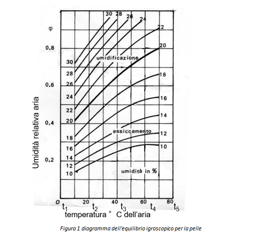 Per i corpi igroscopici come la pelle il diagramma dell’equilibrio, esplicitato nella figura 1, serve per determinare la temperatura e l’umidità che l’aria deve avere per essiccare una pelle ad una desiderata umidità.