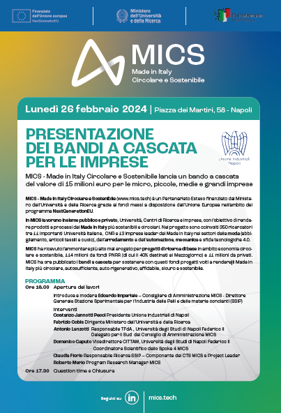 Introdurrà e modererà i lavori Edoardo Imperiale – Consigliere di Amministrazione MICS – Direttore Generale Stazione Sperimentale per l’Industria delle Pelli e delle materie concianti (SSIP). Seguiranno gli interventi di: Costanzo Jannotti Pecci, Presidente Unione Industriali di Napoli; Fabrizio Cobis, Dirigente Ministero dell’Università e della Ricerca; Antonio Lanzotti, Responsabile TFdA, Università degli Studi di Napoli Federico II, Delegato per il Sud del Consiglio di Amministrazione MICS; Domenico Caputo, Vicedirettore CITTAM, Università degli Studi di Napoli Federico II, Coordinatore Scientifico dello Spoke 4 MICS; Claudia Florio, Responsabile Ricerca SIP – Componente del CTS MICS e Project Leader; Roberto Merlo, Program Research Manager MICS.