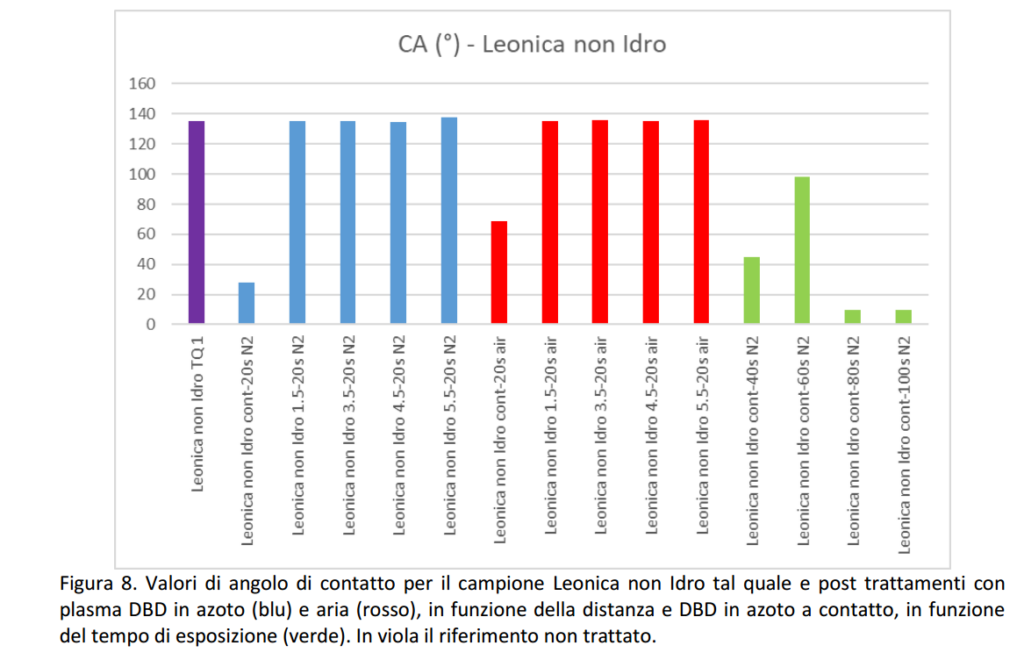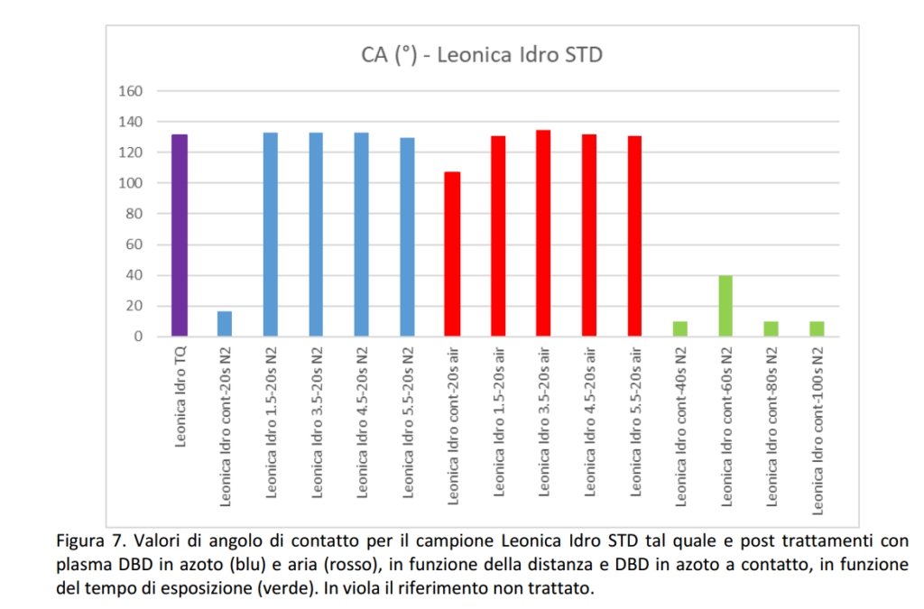 I campioni Leonica Idro STD e Leonica non Idro sono stati sottoposti a trattamento al plasma atmosferico con sorgente DBD ad aria e/o azoto, variando le condizioni di distanza e tempo di esposizione. In questo tipo di sorgente, la temperatura si mantiene sempre in un range di valori che varia da temperatura ambiente a 30-50°C (in funzione del tempo di utilizzo) ma non può essere gestita in modo indipendente. In ciascuna occasione sono state rilevate le coordinate di colore CieLab e l’angolo di contatto prima e dopo l’esposizione, riportandole in grafico per evidenziare meglio le differenze intercorse in seguito ai trattamenti operati.