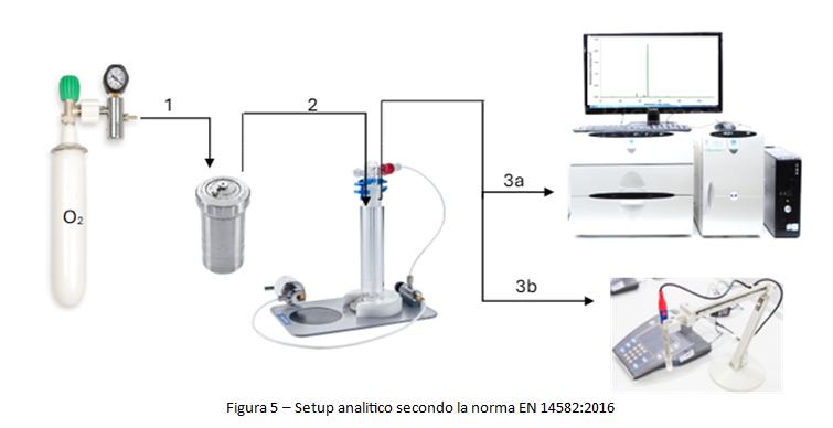 La norma EN 14582:2016, che dichiara un limite di quantificazione non inferiore ai 25 mg di fluoro su kg di campione, prevede di caricare nella bomba calorimetrica una piccola quantità di campione, normalmente dell’ordine dei 200-400 mg per evitare eccessivo sviluppo di calore, oltre opzionalmente ad una certa quantità di acqua o soluzione fissante per i gas di combustione. Nel recipiente viene, poi, caricato ossigeno ad alta pressione (fig. 5/1) ed innescata la combustione. Dopo raffreddamento, i gas di combustione vengono fatti gorgogliare in una soluzione assorbente (fig. 5/2) nella quale viene raccolta anche la soluzione fissante eventualmente utilizzata nel recipiente di combustione.