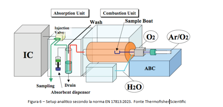 L’altra norma tecnica più utilizzata per l’analisi del fluoro totale è la EN “17813:2023” – Determinazione di alogeni e zolfo mediante combustione piro-idrolitica ossidativa seguita da cromatografia ionica.