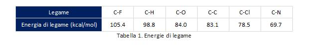 La necessità di utilizzare metodi di mineralizzazione così drastici come una combustione a circa 1000°C deriva dalla peculiarità del legame carbonio-fluoro. L’energia di legame tra tali atomi, infatti, come si nota da Tabella 1 che riporta le energie di legame per i legami singoli, è la più alta tra quelle dei legami che si trovano comunemente in chimica organica.